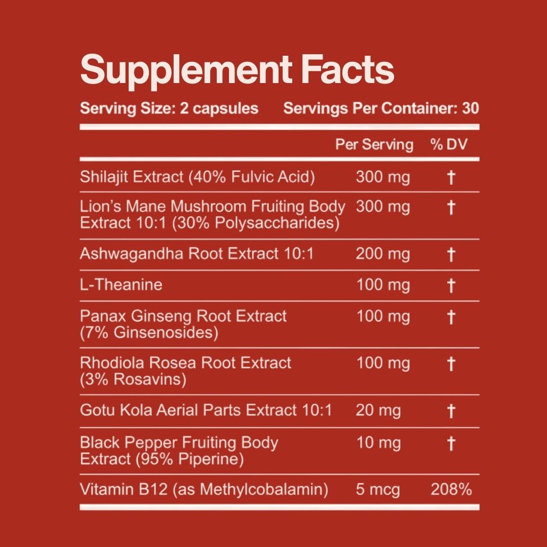 Powered by 9 clinically studied brain-supporting ingredients: from Shilajit and Lion’s Mane to Ashwagandha, Panax Ginseng, Gotu Kola, and Rhodiola Rosea — all in one mighty capsule.